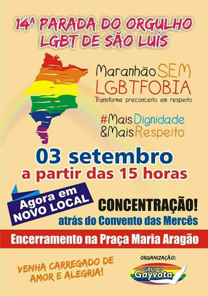 A 14° Parada do Orgulho LGBT de São Luís tem expectativa de Público de 300 mil pessoas. Organizado pelo Grupo Gayvota, o evento acontecerá no domingo (03) às 15 horas se concentrando atrás do Convento das Mercês com encerramento na Praça Maria Aragão.