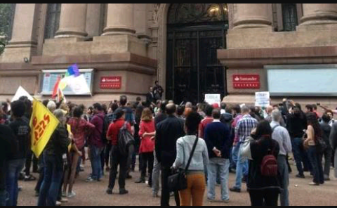 Protesto simultâneo realizados na tarde desta terça-feira (12) em frente ao Santander Cultural, Centro de Porto Alegre, termina com briga entre manifestantes, confronto com a Polícia Militar e dois presos. A Polícia interveio com gás lacrimogêneo e bombas de efeitos moral.
