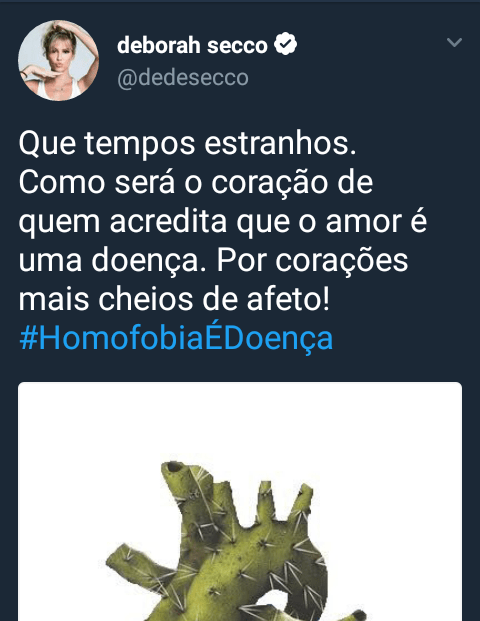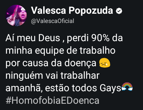 A cantora de Funk Valesca Popozuda usando a TAG #HomofobiaEDoenca disse “Aí meu Deus, perdi 90% da minha equipe de trabalho por causa da doença. Ninguém vai trabalhar, estão todos gays”.