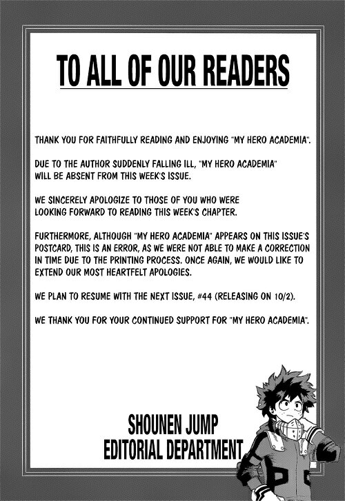 O mangá Boku no Hero Academia ficará sem o capítulo 154 essa semana. O mangaká Kohei Horikoshi foi atingido por uma doença súbita que impossibilitou de terminal o capítulo.