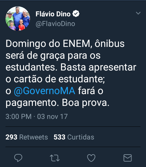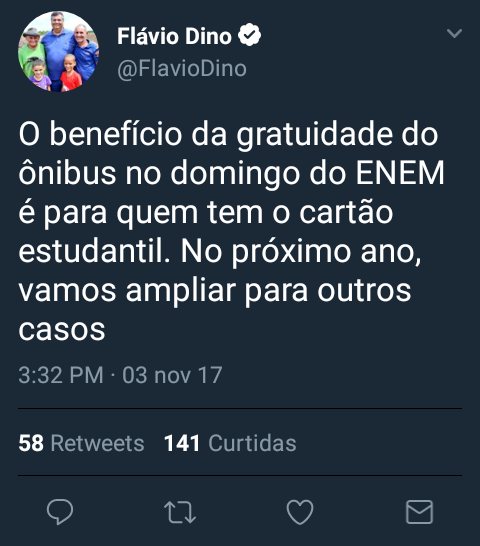O governador do Maranhão, Flávio Dino, anunciou através do Twitter, nesta sexta-feira (3), que os candidatos do Enem que possui carteira de estudante não vão precisar pagar passagem.