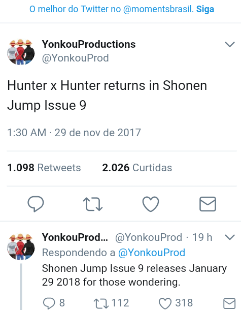 A Yonkou Productions, através de um twitter, nesta quarta-feira (29), confirmou que o mangá de Hunter x Hunter retornará em 29 de janeiro, na 9ª Edição de 2018 da Weekly Shonen Jump.