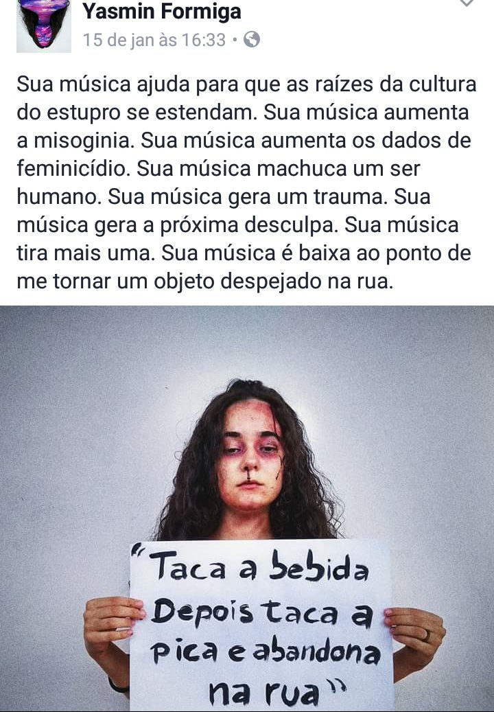 Nesta segunda (15), a universitária Yasmim Formiga usou sua conta no Facebook para demonstrar sua indignação em relação a letra da música.