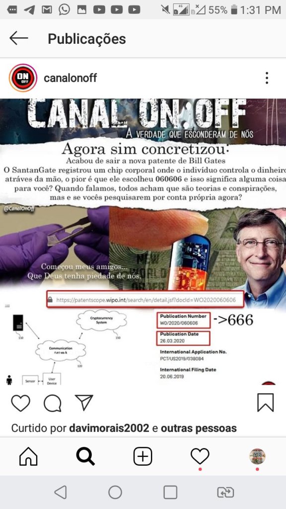 Sites de fake news vem vinculando a noticia que o fundador da Microsoft, Bill Gates, patenteou um chip corporal que possibilita o individuo controlar o dinheiro através da mão e que será produzido pela empresa SantanGate. Ainda informam que no chip existe o código 060606, insinuando a ligação ao satanismo.