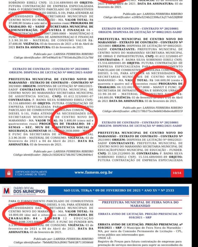 Os dados foram divulgados no Diário Oficial do dia 09 de fevereiro, as vigências dos contratos foram dos 03 de fevereiro a 04 de março e o somatório do dinheiro gasto das secretarias seria no valor aproximado de R$ 380.000,00 (trezentos e oitenta mil reais) em combustível, isso tudo em apenas um mês, a empresa vencedora foi o conhecido Posto 2 Irmãos.