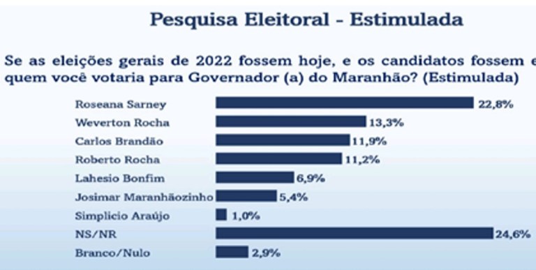 Foi divulgado neste domingo (27), a pesquisa da DataIlha sobre as intenções de voto estimulado. Em um cenário sem o Governador do Maranhão, Flávio Dino (PSB), quem lidera as intenções de voto é Roseana Sarney (MDB). Chegando a possuir 22,8% das intenções de votos.