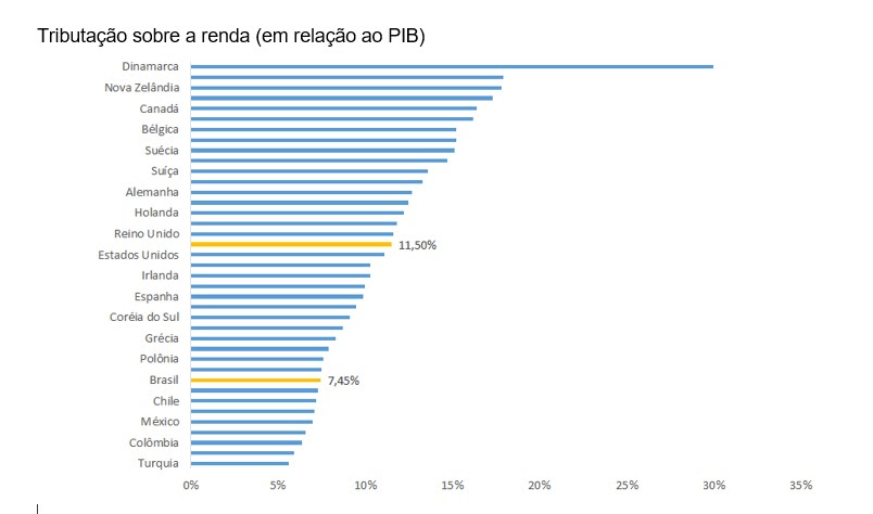 Segundo Pires, há espaço para o país eliminar “distorções” e tributar mais a renda, criando mecanismos para financiar a assistência social. “Uma boa forma de fazer a discussão do financiamento da seguridade social é eliminar distorções, consolidando uma boa parte da tributação na tabela do Imposto de Renda”, disse. Ele ilustra seus argumentos com tabelas que mostram a situação do Brasil em relação a outros países, conforme dados compilados da OCDE e da Receita Federal. A tributação sobre o consumo no Brasil chega a 14,4% do PIB, enquanto a média mundial é de 11%. Já o imposto de renda no Brasil arrecada o equivalente a 7,45% do PIB, bem abaixo da média mundial, de 11,5%.