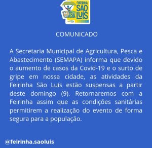 A Secretaria Municipal de Agricultura, Pesca e Abastecimento (SEMAPA) comunicou através de nota a suspensão das atividades da Feirinha São Luís.