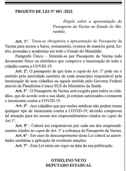 Um Projeto de Lei Nº 001/2022 propõe a adoção de um passaporte vacinal contra o covid-19 em todo o Estado do Maranhão.