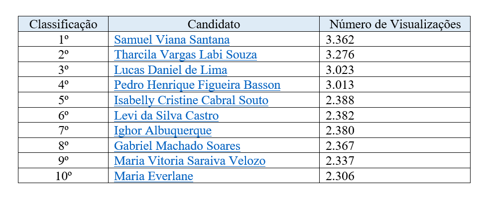 Veja abaixo os nomes e o número de visualizações dos finalistas: