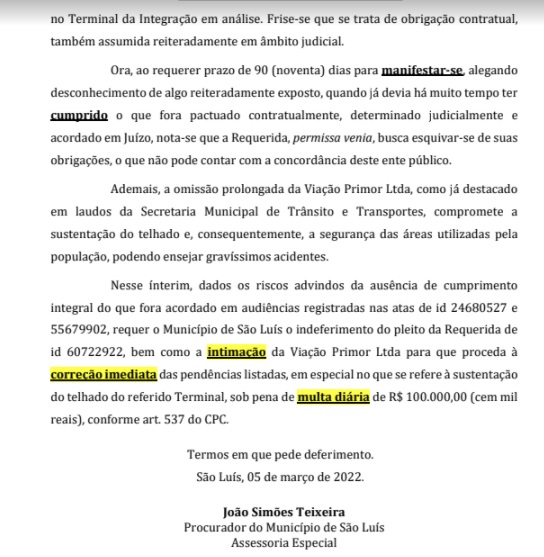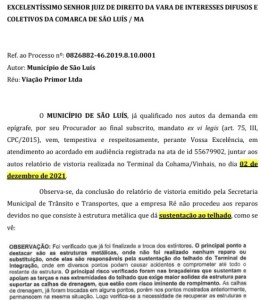 Fica constatado que a empresa responsável pelo terminal da Cohama acabou descumprindo decisão da Vara de Interesses e Difusos, mesmo após a realização de audiências e ser notificada, com antecedência, pela Prefeitura, dos problemas existentes na estrutura.