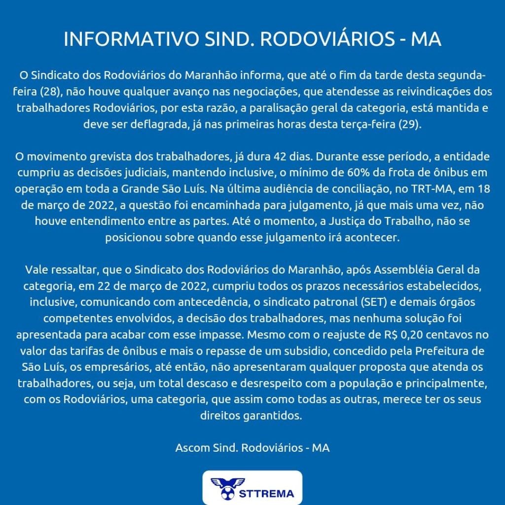 Vale ressaltar, que o Sindicato dos Rodoviários do Maranhão, após Assembléia Geral da categoria, em 22 de março de 2022, cumpriu todos os prazos necessários estabelecidos, inclusive, comunicando com antecedência, o sindicato patronal (SET) e demais órgãos competentes envolvidos, a decisão dos trabalhadores, mas nenhuma solução foi apresentada para acabar com esse impasse. Mesmo com o reajuste de R$ 0,20 centavos no valor das tarifas de ônibus e mais o repasse de um subsidio, concedido pela Prefeitura de São Luís, os empresários, até então, não apresentaram qualquer proposta que atenda os trabalhadores, ou seja, um total descaso e desrespeito com a população e principalmente, com os Rodoviários, uma categoria, que assim como todas as outras, merece ter os seus direitos garantidos.