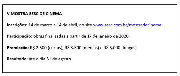 Já consolidada como uma das principais iniciativas de incentivo ao cinema independente no Brasil, a Mostra Sesc de Cinema – MSDC chega a sua quinta edição este ano. Realizadores e realizadoras de todas as regiões do país poderão inscrever suas obras até 14 de abril, com longas, médias e curtas metragens de temas variados. Para participar, as obras devem ter sido finalizadas a partir de 1º de janeiro de 2020 e a lista com as produções selecionadas será divulgada até o dia 31 de agosto. Até o momento, o projeto já recebeu cerca de 1.200 obras de todas as regiões do Brasil.