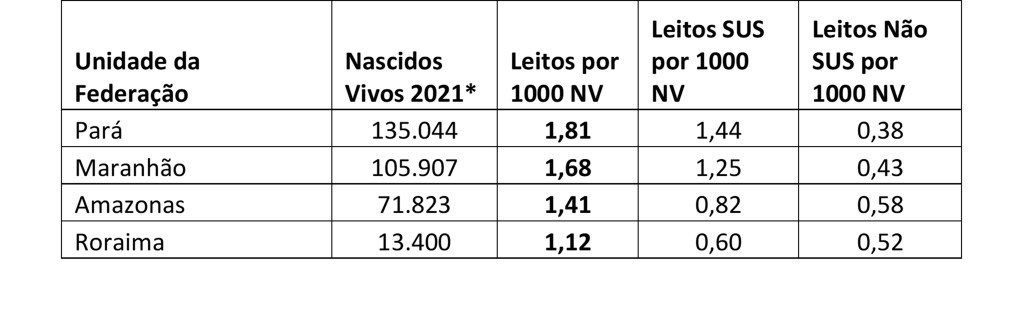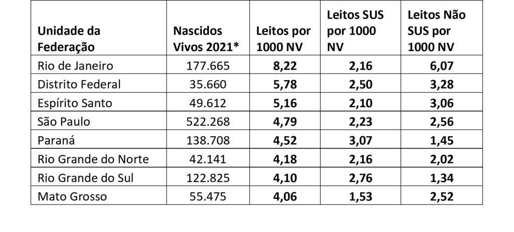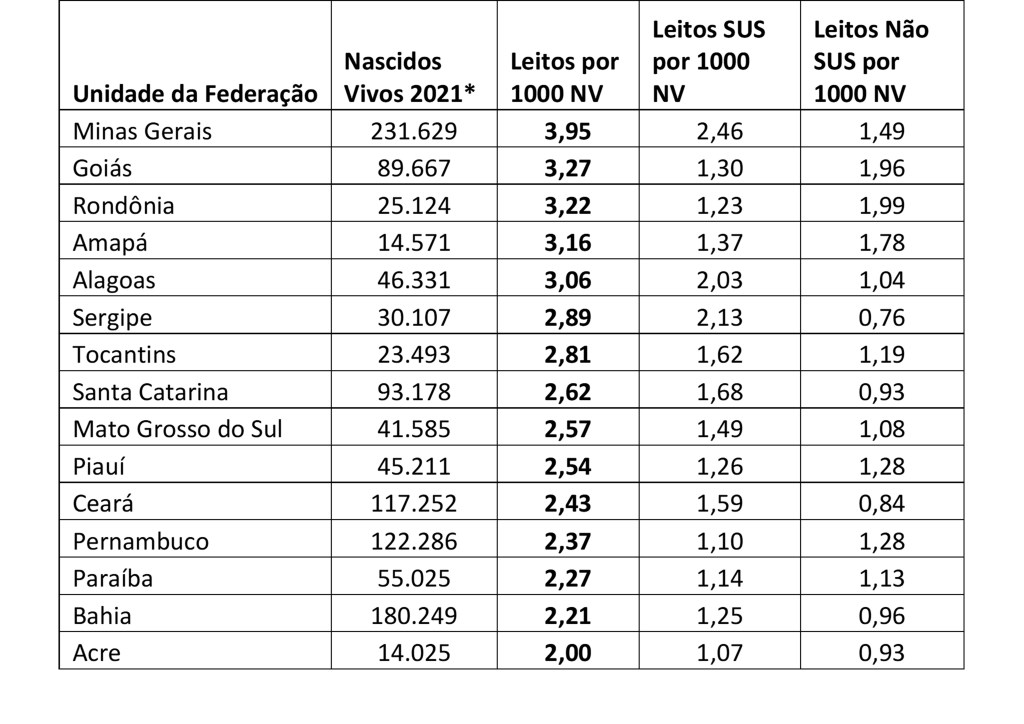 Contabilizando o total de UTI’s neonatal disponibilizadas no país, sem considerar diferenças de demandas regionalizadas, o Brasil oferece uma média de 3,74 unidades para cada mil nascidos vivos. Já se considerarmos a disponibilidade de leitos apenas pelo SUS, a média é de 1,89 leitos, abaixo inclusive do recomendado pelo próprio Ministério da Saúde.