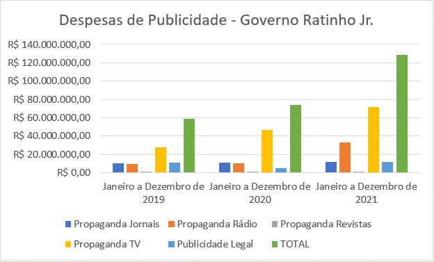 É importante mencionar que para chegar a esses dados foram consideradas apenas as despesas declaradas pelo governo do Estado em propaganda nas emissoras de rádio e TV, jornais e revistas e em publicidade legal (esta referente à publicação de editais, avisos, entre outros comunicados que órgãos da administração pública são obrigados a divulgar por força de lei) excluindo-se, por exemplo, aquelas que são veiculadas por meio da internet – que, muitas vezes, também beneficiam os ‘barões da mídia’ – e, também, a contratação de serviços de impulsionamento de postagens em redes sociais e a contratação de outros serviços publicitários. Logo, as cifras são certamente ainda maiores.