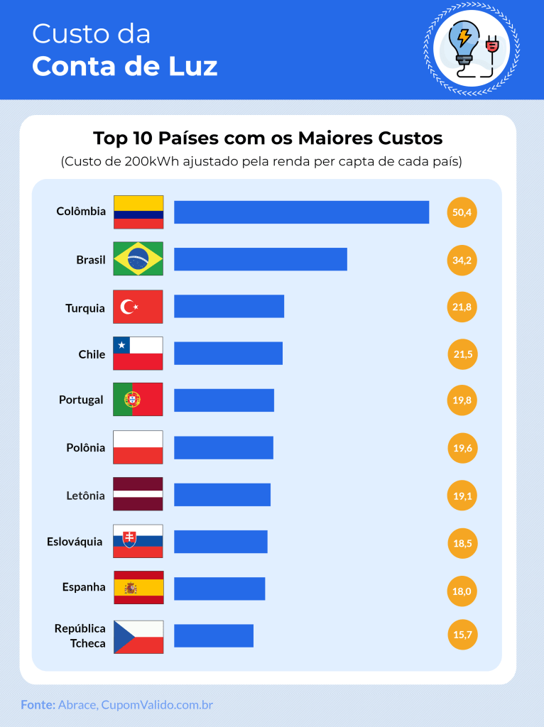 É o que revela um estudo divulgado pela plataforma de cupons de descontos CupomValido.com.br com dados da Abrace (Associação dos Grandes Consumidores Industriais de Energia e de Consumidores Livres) sobre o custo da energia no país.