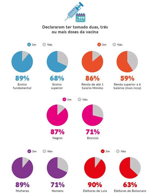 Destaque 1: 41% dos mais ricos sequer tomaram ou estão com apenas uma dose de vacina. Adesão foi maior entre mais pobres, menos instruídos, mulheres e negros.