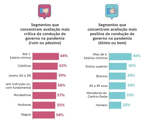 A melhor avaliação do governo na condução da pandemia advém dos segmentos: homens, brancos, com mais de 40 anos, moradores do Centro-Oeste, evangélicos, de nível superior, com mais de 6 SM. Além, evidentemente, dos eleitores de Bolsonaro: 74% consideram a condução na pandemia ótima e boa, contra menos de 2% de aprovação entre eleitores de Lula. Já entre eleitores de Ciro, 43% consideram a condução regular.