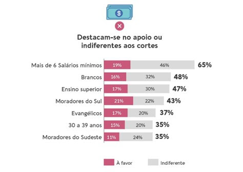 De outro lado, entre os que mais desaprovam os cortes estãos os jovens, negros e de menor escolaridade. 64% da juventude brasileira (de 16 a 29 anos) são contra os cortes. Mas o dado mais expressivo, sem dúvida, é o etnicorracial: 75% das pessoas pretas e 73% das pardas se posicionaram contra os cortes, frente a apenas 46% das pessoas brancas – que, por sua vez, podem manifestar ressentimento com a política de cotas, tal como os mais ricos. É possível relacionar essa posição com a abertura de vagas por meio de políticas afirmativas para negros, que passam a fazer parte e a defender o sistema público de ensino superior com maior veemência.