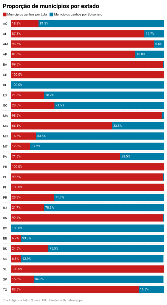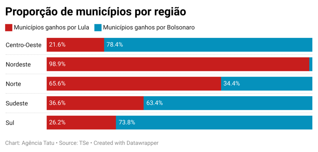 No entanto, na perspectiva do número de municípios onde cada candidato ganhou, é possível observar outras características. Lula foi o candidato mais votado em 3.123 municípios brasileiros, contra 2.444 onde Bolsonaro venceu.