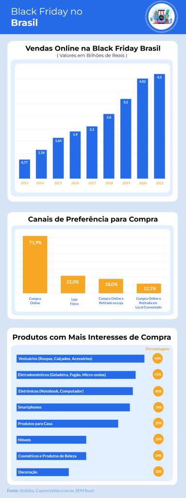 Segundo a pesquisa, 71,9% dos brasileiros preferem realizar as compras online na Black Friday. Em contrapartida, 22% preferem realizar as compras nas lojas físicas.