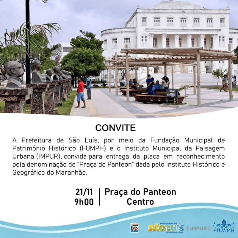 A Prefeitura de São Luís, por meio da Fundação Municipal de Patrimônio Histórico (FUMPH) e o Instituto Municipal da Paisagem Urbana (IMPUR), entrega nesta segunda-feira (21), às 9h, na Praça do Pantheon, a placa em reconhecimento pela denominação de “Praça do Panteon”, dada ao local pelo Instituto Histórico e Geográfico do Maranhão (IHGM), conforme requerimento aprovado pela Câmara Municipal de São Luís, em 29 de março de 1954.