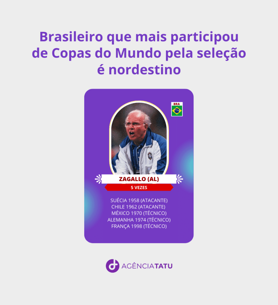 No ranking de jogadores brasileiros que mais participaram de Copas do Mundo, o primeiro lugar é do nordestino Zagallo, natural de Alagoas, que fez parte de cinco campeonatos, seja como atacante ou como treinador da seleção brasileira. Em seguida, alguns nomes, que não são de nordestinos, aparecem com quatro repetições, como os cariocas Thiago Silva e Ronaldo, o paulista Cafu e o gaúcho Dunga.