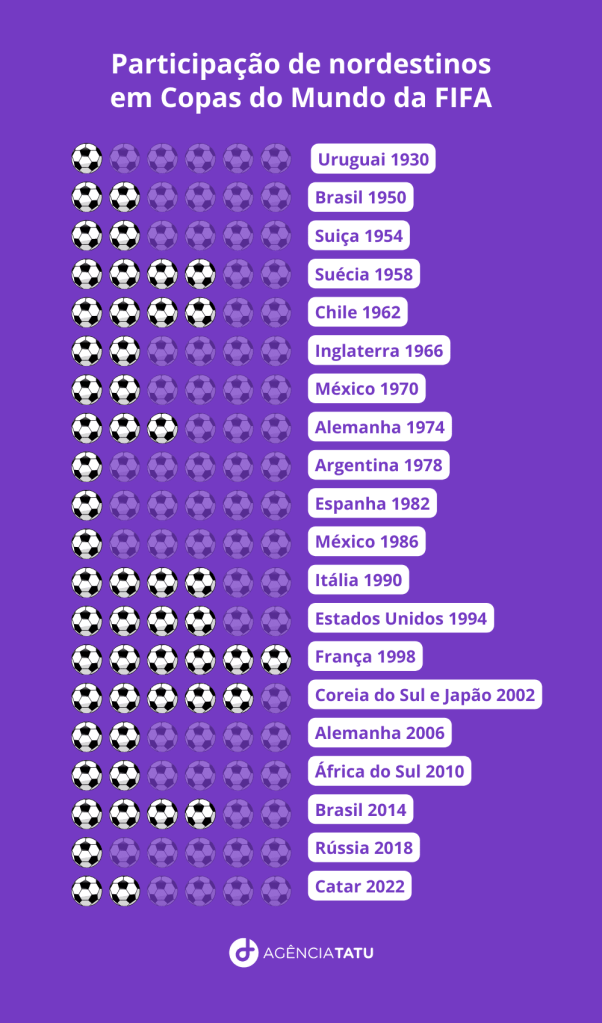 Ser o único país cuja seleção masculina de futebol participou de todas as Copas do Mundo da FIFA faz jus ao título de “país do futebol” para o Brasil. Para conhecer melhor os times que fizeram parte do campeonato mundial, a Agência Tatu fez um levantamento da naturalidade de todos os jogadores e técnicos que já passaram pela seleção brasileira ao longo das Copas do Mundo e os dados revelam que, dentre os 355 futebolistas, somente 35 são nordestinos.