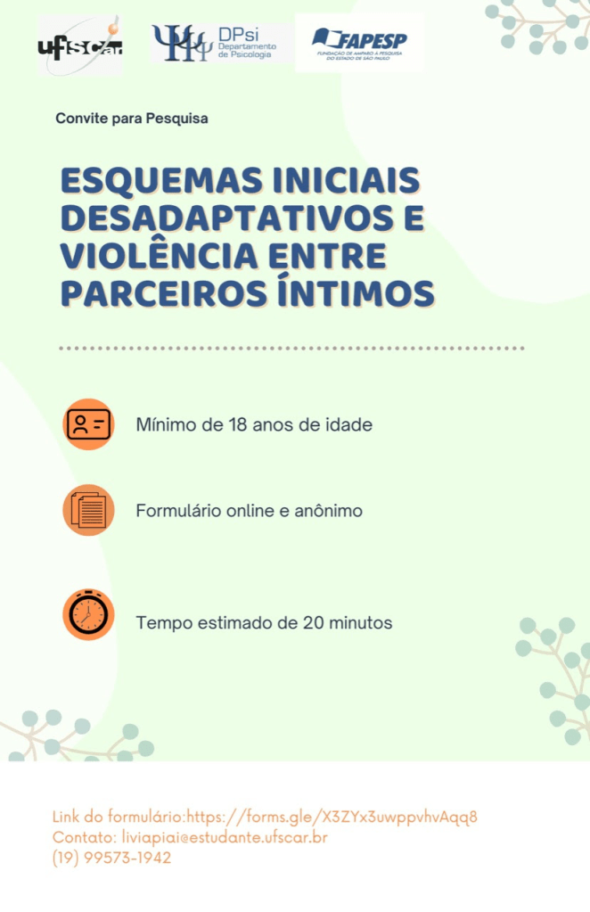 O que são esquemas iniciais desadaptativos e como são encontrados em pessoas que se envolveram em relacionamentos com violência? Para investigar essa relação, uma pesquisa da Universidade Federal de São Carlos (UFSCar) na área da Psicologia está convidando voluntários que tenham ou não sofrido algum tipo de violência para responderem um questionário online.