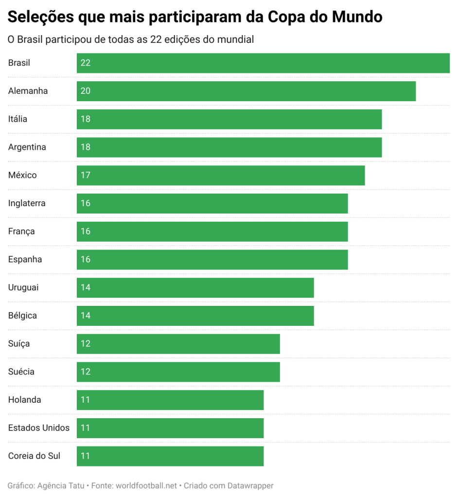 Entre as seleções que mais participaram das Copas do Mundo, o Brasil está no topo e é a única seleção que participou de todas as 22 edições realizadas desde 1930. A seleção alemã está na segunda colocação, com 20 participações, seguida da Itália, com 18.