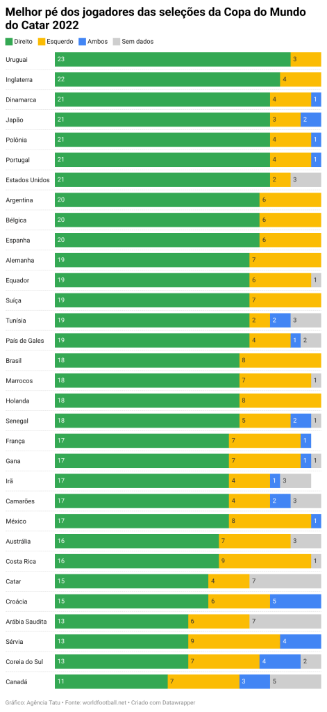 Um dado que chama a atenção é em relação ao pé com que melhor chutam os jogadores convocados por cada seleção na Copa do Mundo do Catar. Neste quesito, o Uruguai se destaca por ter convocado 23 atletas, entre os 26 totais, que chutam melhor com o pé direito.