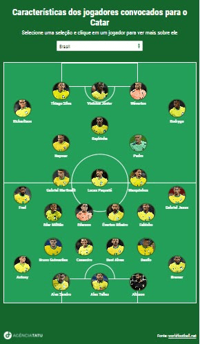 No infográfico abaixo é possível filtrar por uma determinada seleção que atuou no mundial deste ano e ver mais características de cada um dos jogadores convocados, como o peso de cada atleta, a altura, cidade natal, data de nascimento e o melhor pé.