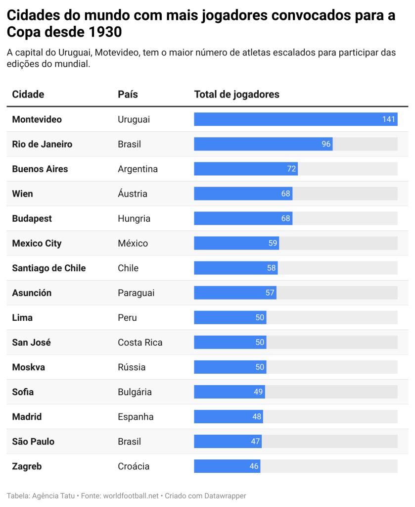 Deste total de atletas, Montevidéu, capital uruguaia, foi a que mais teve atletas nascidos na cidade convocados para uma Copa do Mundo, com um total de 141. A segunda com mais jogadores convocados foi o Rio de Janeiro, com 96 nascidos na cidade.