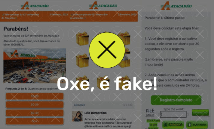 A empresa já fez um alerta no Linkedin sobre os riscos de links falsos, já que a marca é utilizada em outras informações falsas, como oferta de vagas e distribuição de cestas básicas. “Viu um formulário para captação de dados? Fique atento e tenha muito cuidado! Não solicitamos dados pessoais, pagamentos ou compartilhamento de links com contatos para que você participe de um processo seletivo, promoção ou doação”, diz trecho da mensagem divulgada pelo Atacadão.
