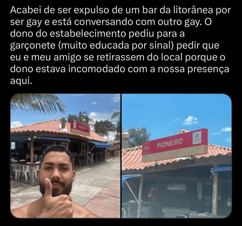 Conforme o relato da denuncia, dois jovens homossexuais foram expulsos do estabelecimento porque o dono estava incomodado com a presença dos dois.