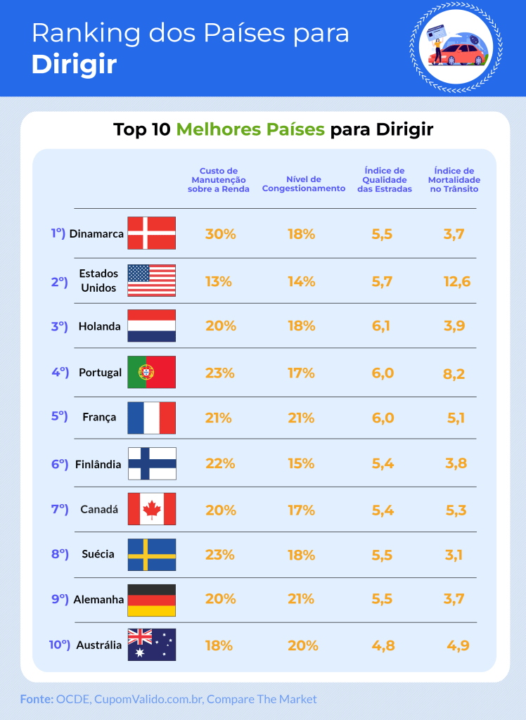 A Dinamarca é o melhor país para dirigir do mundo. O país possui um dos menores índices de mortalidade no trânsito, apenas 3,7 a cada 100.000 pessoas. Além de possuir estradas de alta qualidade (5,5) e baixo nível de congestionamento (18%).