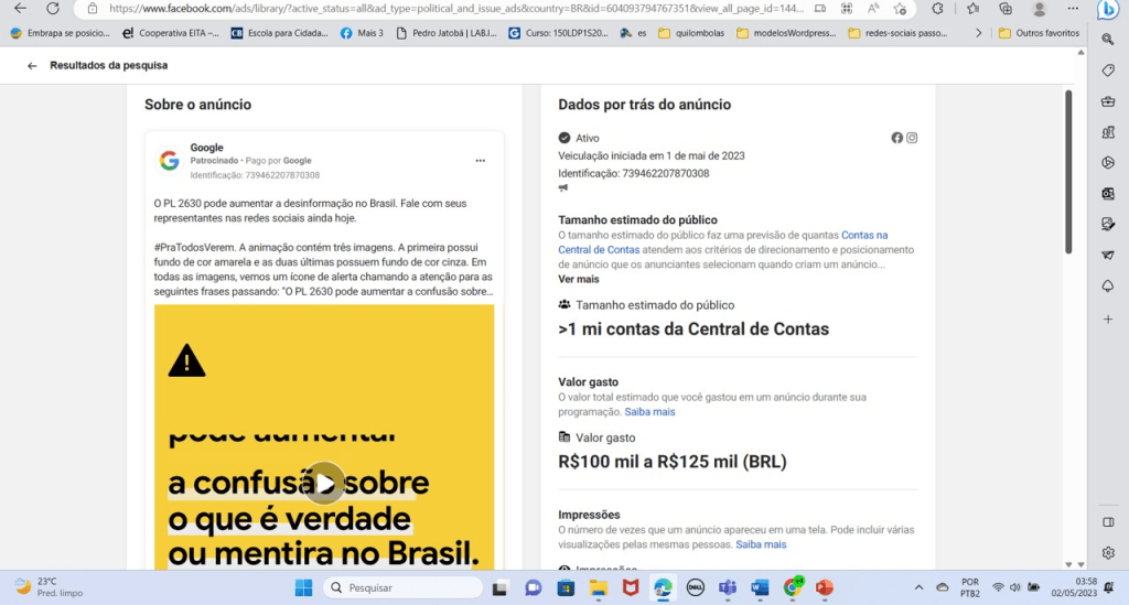 Consulta em 02/05/2023: https://www.facebook.com/ads/library/?active_status=all&ad_ty02/05/203 pe=political_and_issue_ads&country=BR&id=604093794767351&view_all_page_id=1442144612756143&search_type=page&media_type=all
