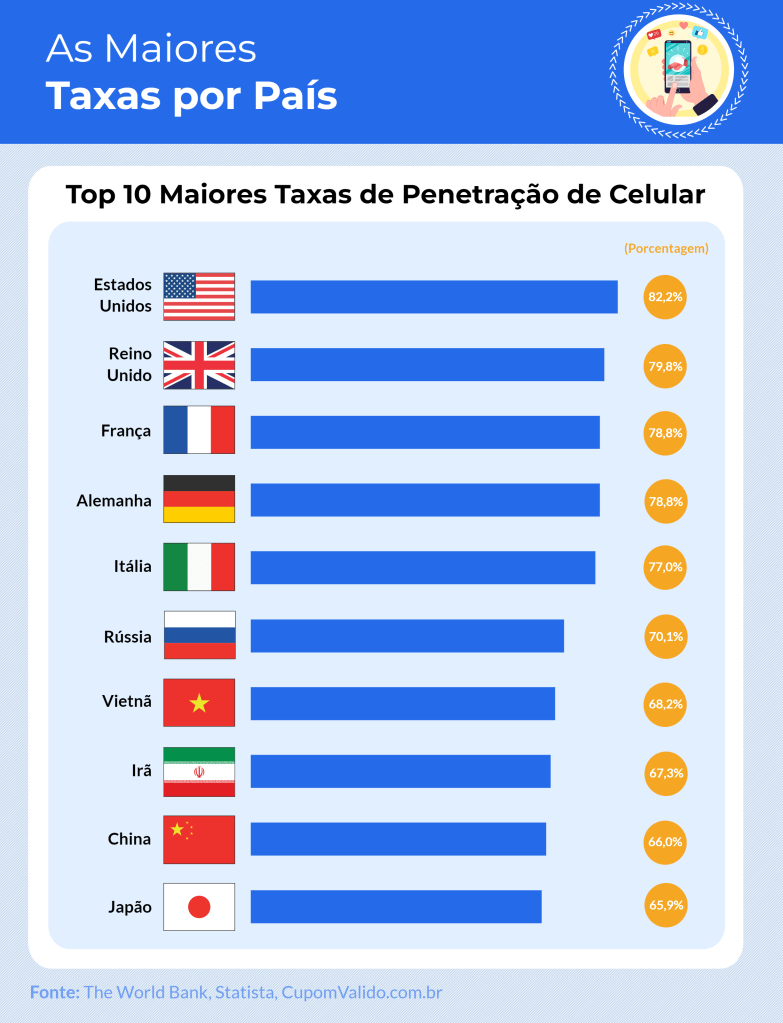 É o que revela um estudo divulgado pela plataforma de descontos CupomValido.com.br com dados da The World Bank e Statista sobre os smartphones no mundo.