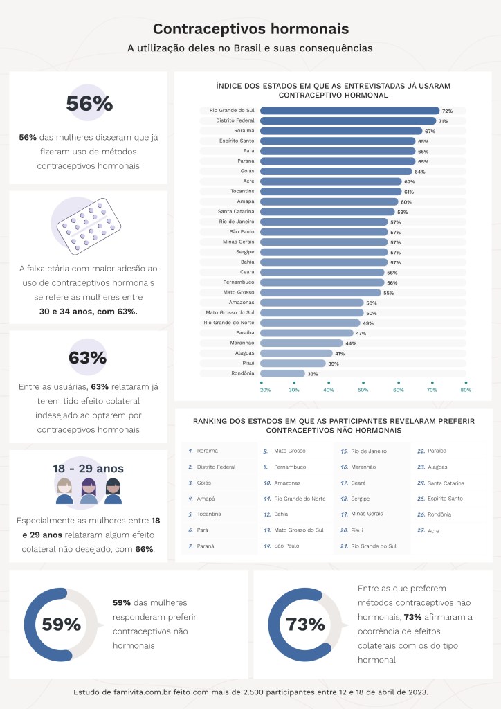 Os dados coletados por Estado mostraram que o Rio Grande do Sul é a localidade onde mais mulheres afirmaram já terem utilizado contraceptivos hormonais, com 72%. Distrito Federal, Roraima e Espírito Santo aparecem em seguida no ranking, com 71%, 67% e 65%, respectivamente. São Paulo e Rio de Janeiro figuram no índice com 57%.