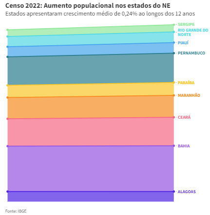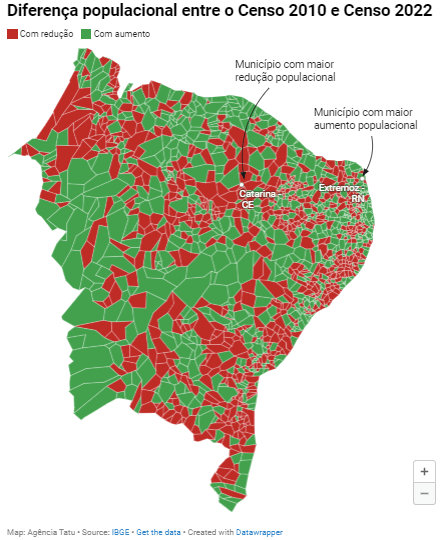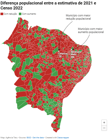 De acordo com os dados analisados pela Agência Tatu, dos 1.794 municípios do Nordeste, 1.369 tiveram uma redução em sua população em relação aos dados da estimativa populacional de 2021. Nesse cenário de redução, os municípios de Catarina, no Ceará; Salgadinho, em Pernambuco; e Campo Alegre, em Alagoas, são as localidades mais impactadas pela redução populacional.