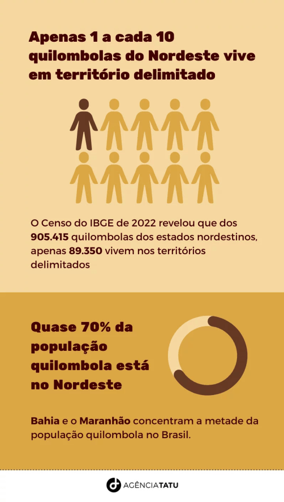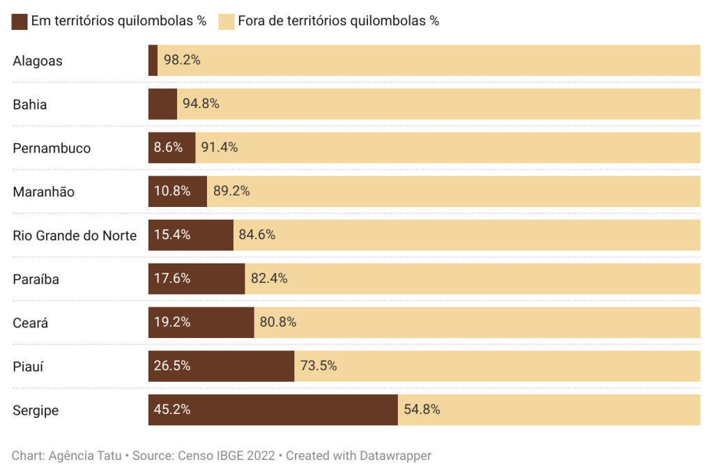 A Agência Tatu analisou os dados divulgados pelo Instituto Brasileiro de Geografia e Estatística (IBGE). Dos 905.415 quilombolas dos estados nordestinos, apenas 89.350 vivem nos territórios quilombolas e 816.065, correspondente a 90,13%, se autodecalaram ao IBGE como quilombolas, mas que estão fora das terras delimitadas do grupo étnico.