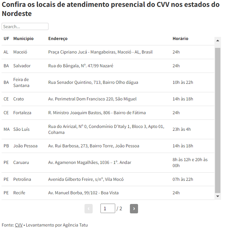 Segundo o relatório mais recente do CVV, referente ao segundo trimestre de 2023, existem 110 postos de atendimento presencial em todo o Brasil, sendo que 15 deles estão dispostos em estados do Nordeste.