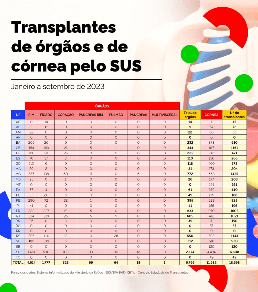 Com relação ao transplante de córnea, o quantitativo foi superior a 2022. Considerando o mesmo recorte – entre janeiro e setembro –, o total de cirurgias em 2023 foi de 11.932, contra 10.544 do ano anterior.