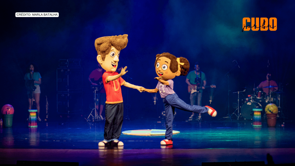 Aqui os movimentos do corpo não são ilustrativos e superficiais, eles servem ao entendimento das expressões que o público deve ler sem cair em clichês exagerados. Este trabalho de preparação corporal dos atores acompanha as coreografias assinadas por Dandara Ferreira, se utilizando da distribuição dos espaços, interação entre personagens, movimentos expressivos e envolventes. Tive a sensação de que Dandara vê o dançar como uma brincadeira, combinando movimentos nas letras das músicas com muita fluidez. Aqui as coreografias tratam o corpo como brinquedo, os personagens Dindo, Titi, dois construtores e uma narradora, dançam juntos, se dividem em coreografias majoritariamente frontais sem deixar de explorar as lateralidades e as possibilidades do corpo que se forma no coletivo, muito diferente dos musicais que se limitam a abrir dedos e deixar as pernas abertas na boca de cena. Cada música é dançada como uma brincadeira que não queremos que acabe.