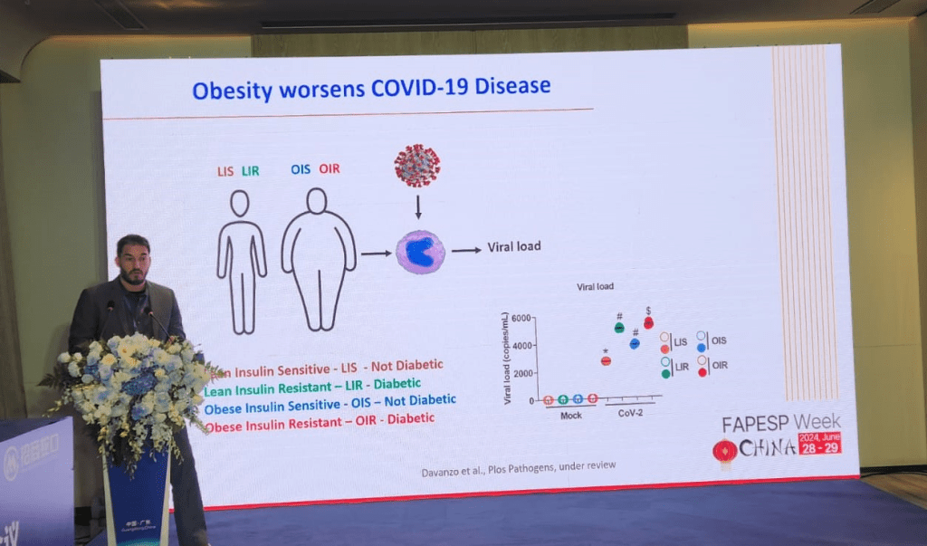 Ao analisar amostras de obesos não diabéticos, pesquisadores da Unicamp descobriram que teores sanguíneos elevados de ácidos graxos saturados causam uma pré-ativação de células do sistema imune inato que, ao serem infectadas pelo SARS-CoV-2, produzem níveis aumentados de moléculas inflamatórias. Resultados foram apresentados durante a FAPESP Week China