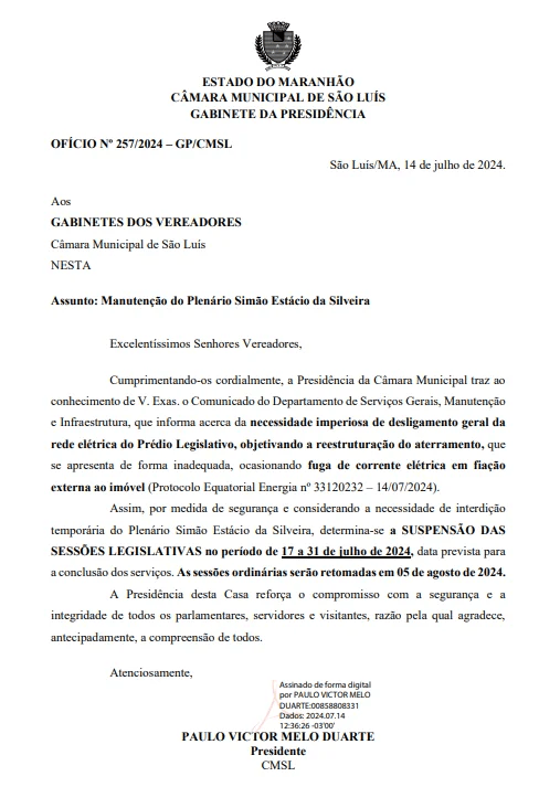 Paulo Victor justificou a necessidade do recesso pelo desligamento geral da rede elétrica do Prédio Legislativo, necessário para a reestruturação do sistema de aterramento. O problema teria sido identificado como a causa de fuga de corrente elétrica em fiação externa ao edifício, exigindo uma intervenção imediata para garantir a segurança e a integridade das instalações.