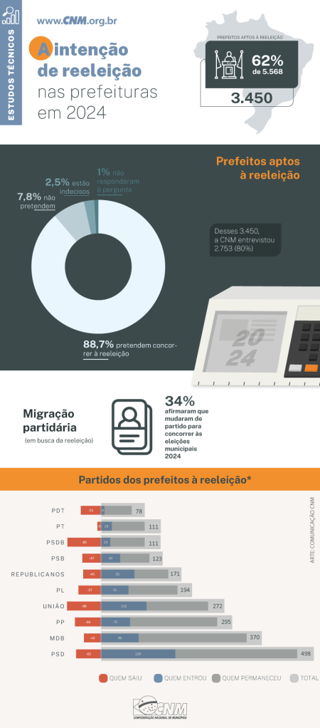 Um estudo divulgado nesta quinta-feira (15), pela Confederação Nacional de Municípios (CNM), revelou que mais de um terço dos prefeitos aptos à reeleição em 2024 mudaram de partido com o objetivo de concorrer ao próximo pleito. O levantamento, apresentado em coletiva de imprensa pelo presidente da entidade, Paulo Ziulkoski, destacou que 34% dos prefeitos ouvidos na pesquisa optaram pela mudança de legenda visando melhores chances de sucesso nas eleições municipais.