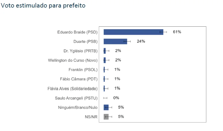Na pesquisa estimulada — quando os eleitores recebem uma lista de candidatos — Eduardo Braide lidera com folga, somando 61% das intenções de voto. Duarte Jr (PSB), seu principal adversário, aparece com 24%. Outros candidatos, como Dr. Yglésio (PRTB) e Wellington do Curso (Novo), pontuam apenas 2% cada. Franklin (PSOL), Fábio Câmara (PDT) e Flávia Alves (Solidariedade) alcançam 1% cada. Saulo Arcangeli (PSTU) não registrou intenções de voto. Votos nulos e brancos totalizam 5%, e o mesmo percentual foi registrado para eleitores que não souberam ou não responderam.