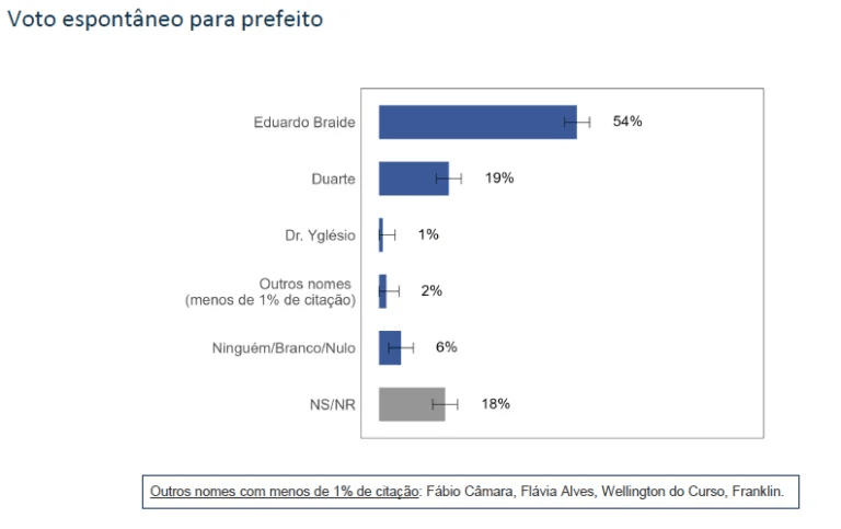 Na análise espontânea — quando os entrevistados não recebem uma lista de candidatos — Eduardo Braide continua à frente, com 54% das intenções de voto, seguido de Duarte Jr, que tem 19%. Outros candidatos, incluindo Dr. Yglésio, não ultrapassam 1%. Nessa modalidade, 6% dos eleitores disseram que votariam em branco ou nulo, enquanto 18% não souberam ou não responderam.