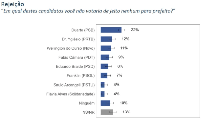 A pesquisa também mediu a rejeição dos candidatos, perguntando aos eleitores em quem eles não votariam de forma alguma. Os resultados refletem as dificuldades que alguns postulantes enfrentam para conquistar o eleitorado, mas esses dados não foram detalhados.